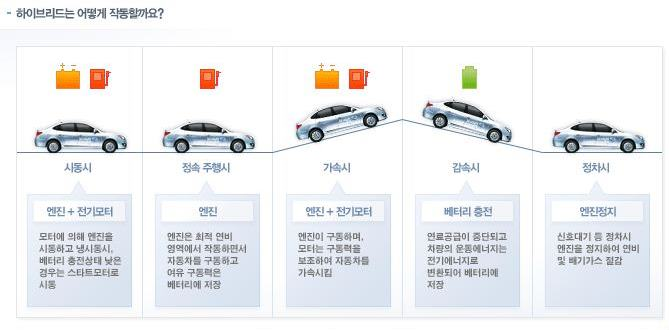 | 저속 주행 | 전기 모터 | 배터리에서 전력을 공급받아 내연기관 없이 주행 |