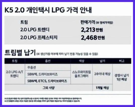 또한, 가격 면에서도 경쟁력이 있습니다. K5 택시의 시작 가격은 2213만 원에서 2468만 원 사이로, 현대 쏘나타 택시보다 더 저렴한 가격을 제시하고 있습니다.